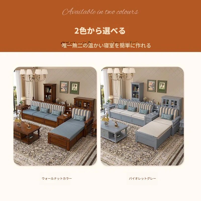アメリカンヴィンテージスタイルの無垢材ソファ!リビングにぴったりなデザインで、貴婦人スタイルのコンビネーション。モダンでラグジュアリーな雰囲気を演出し、冬夏両用の収納機能付き。大中小どんなお部屋にも最適です!
