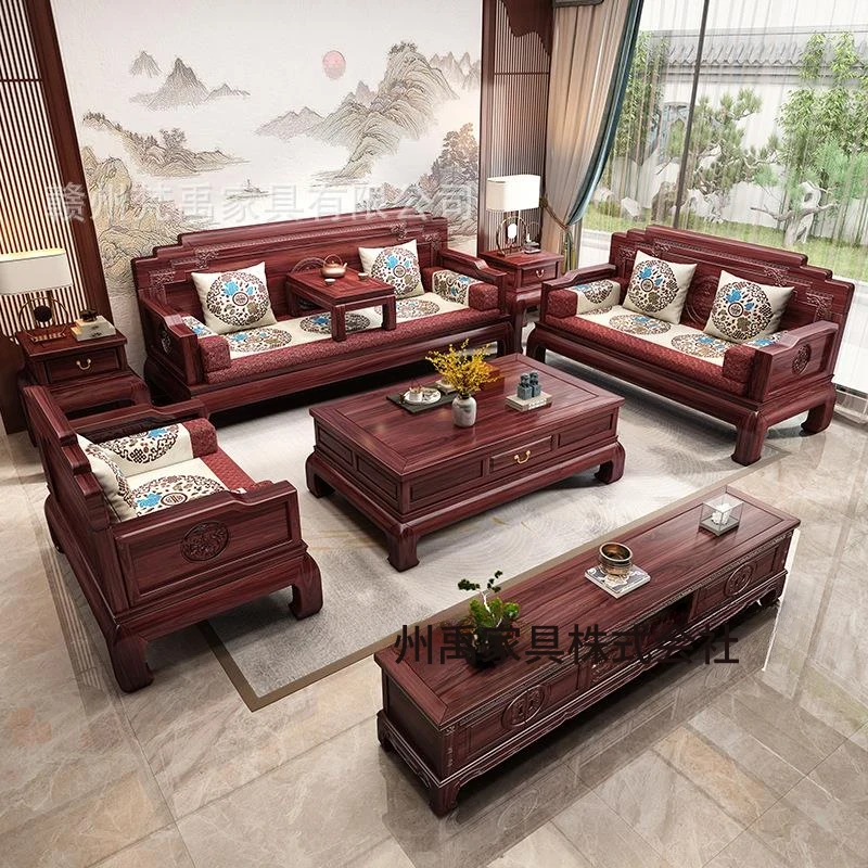 新中式高級実木ソファー - 赤檀木の上質なデザイン、小型リビングに最適な多人数用貴妃ソファーセットで、洗練されたインテリアを演出!