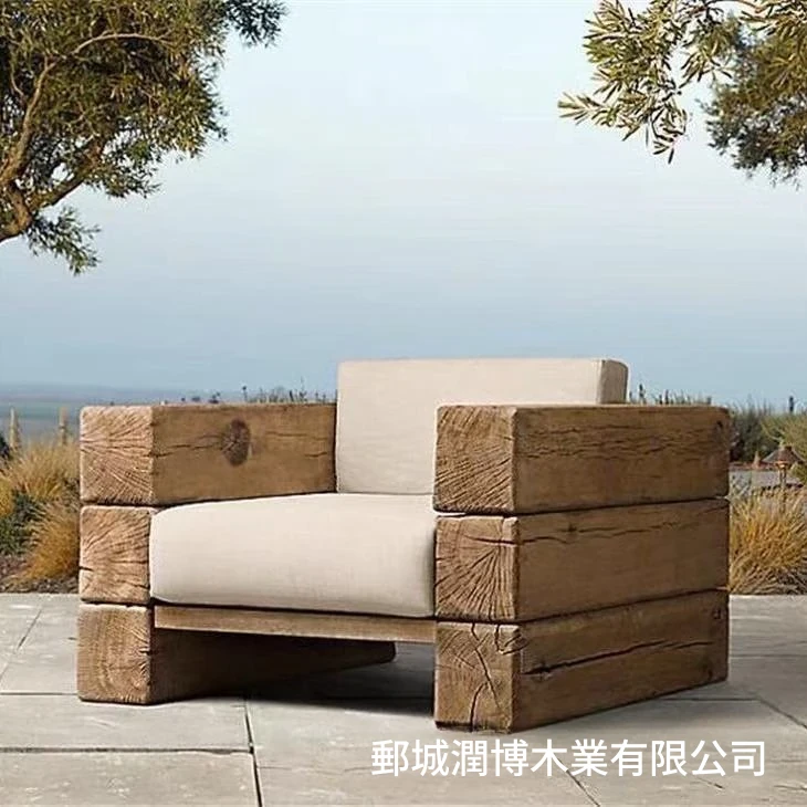 アンティーク風の老ユ木製アウトドアソファー - テラスや庭にぴったり!別荘、民宿、ホテル、クラブに最適なカスタムメイドのリラックスチェアで、上質なひとときをお楽しみください。