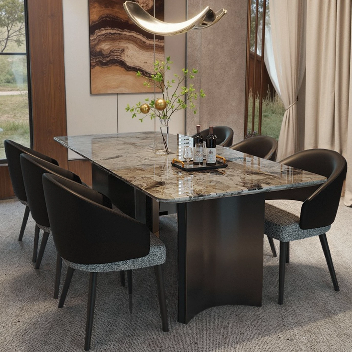 天然石材を使用した高級感溢れるパンドラダイニングテーブルセット - モダンな大理石とゴールドデザインの洗練されたダイニングチェアのコンビネーションで、お洒落な食卓を演出します。