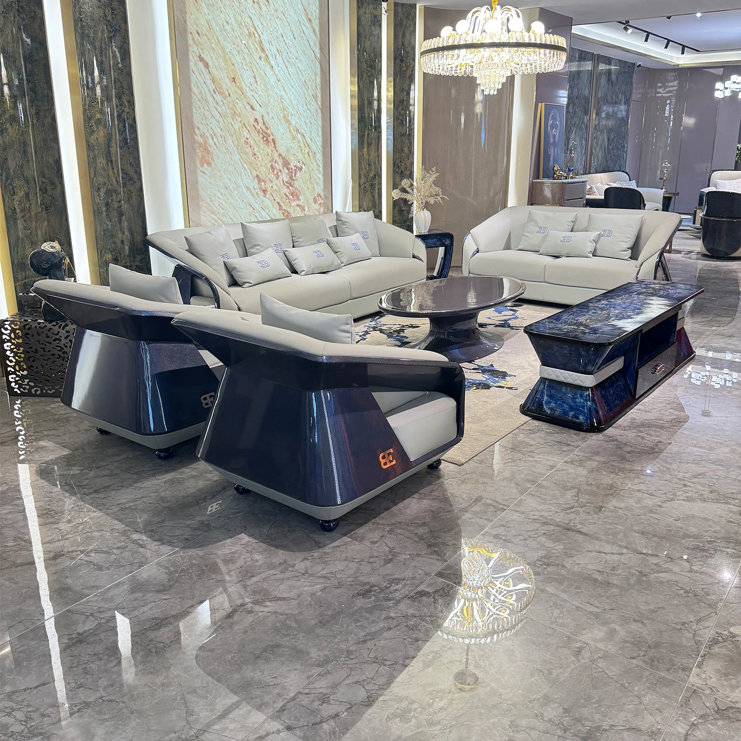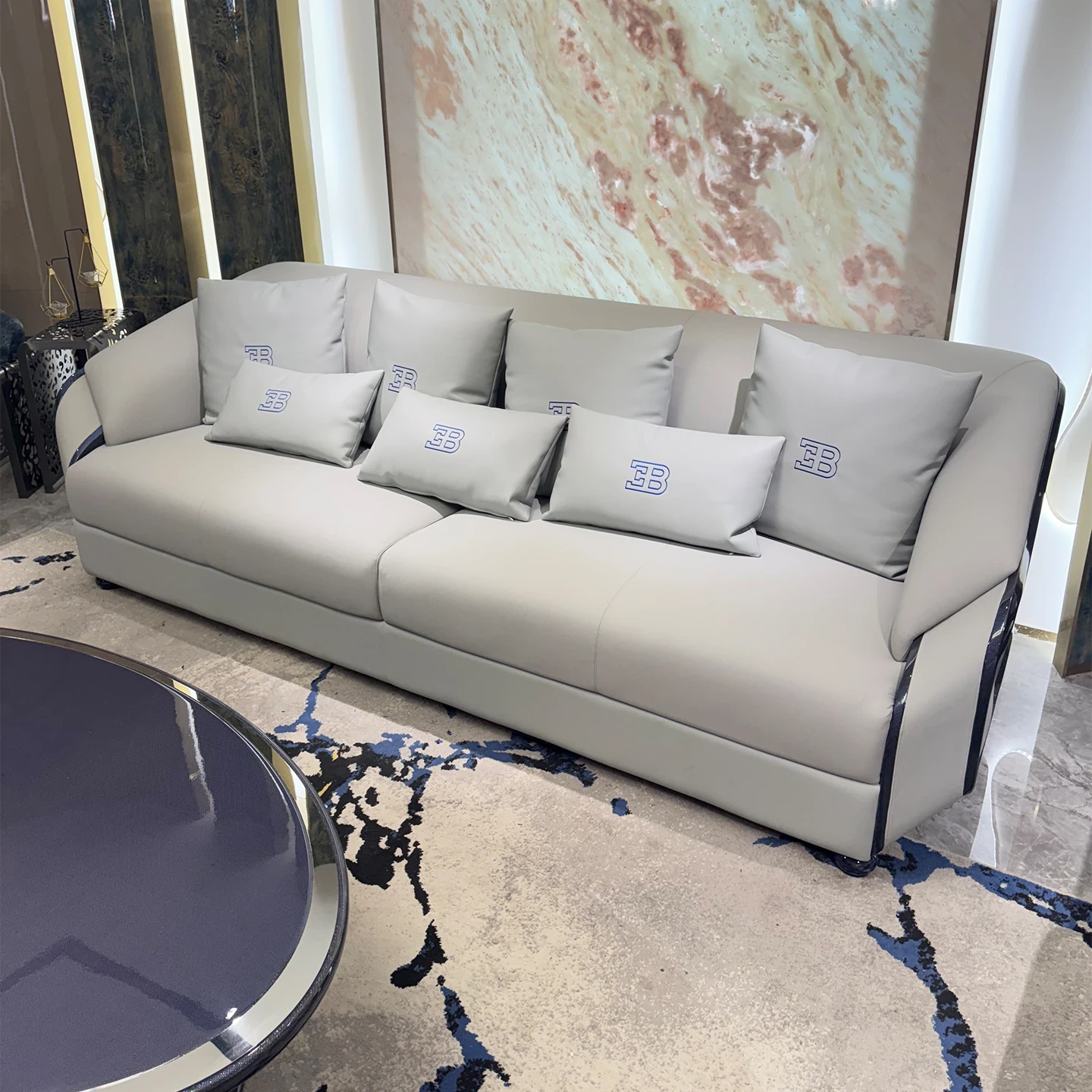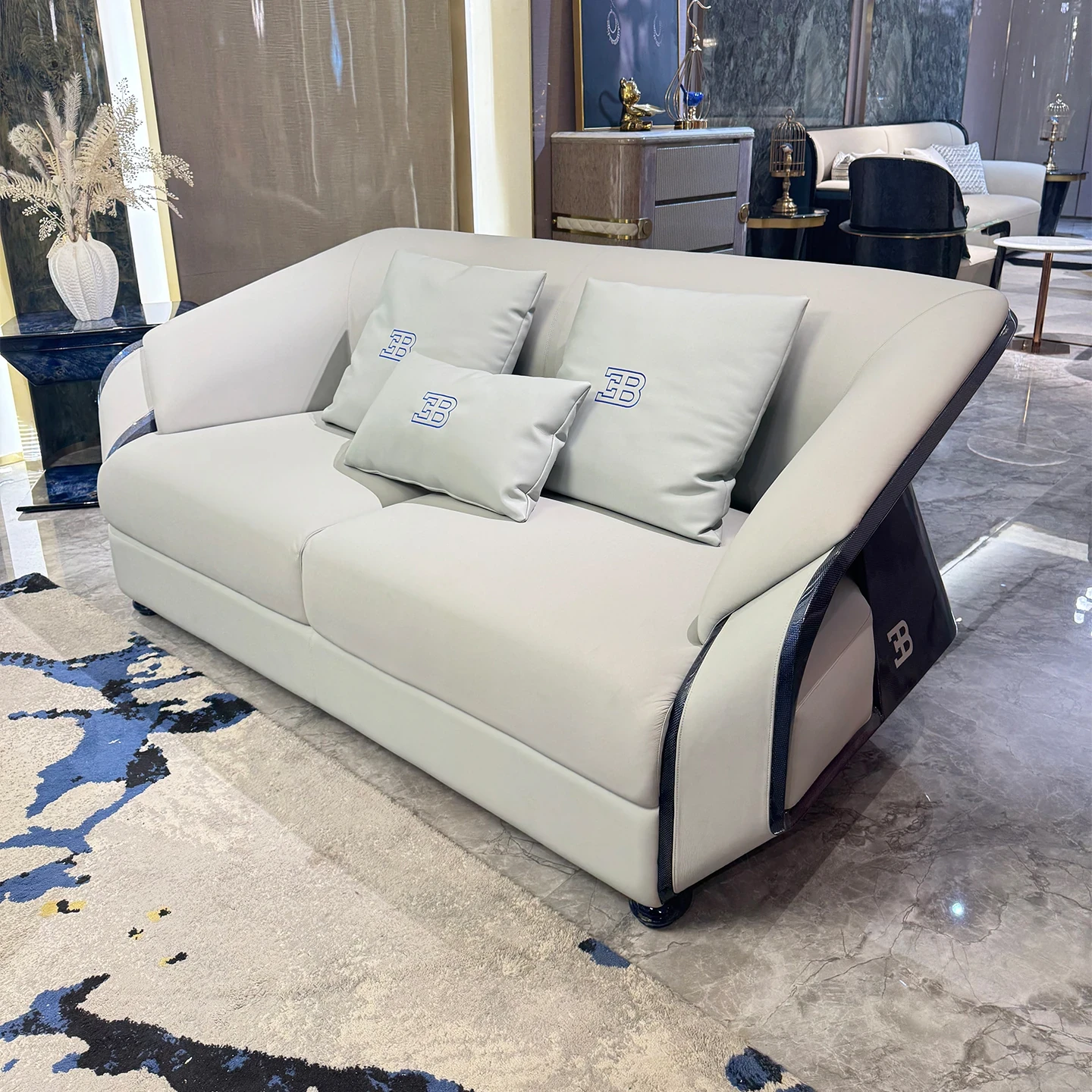 イタリアンラグジュアリー ブガッティ本革ソファセット - 豪華なヴィラや高級マンションにぴったりのリビングルーム用、無垢材の高級家具で特別な空間を演出します。