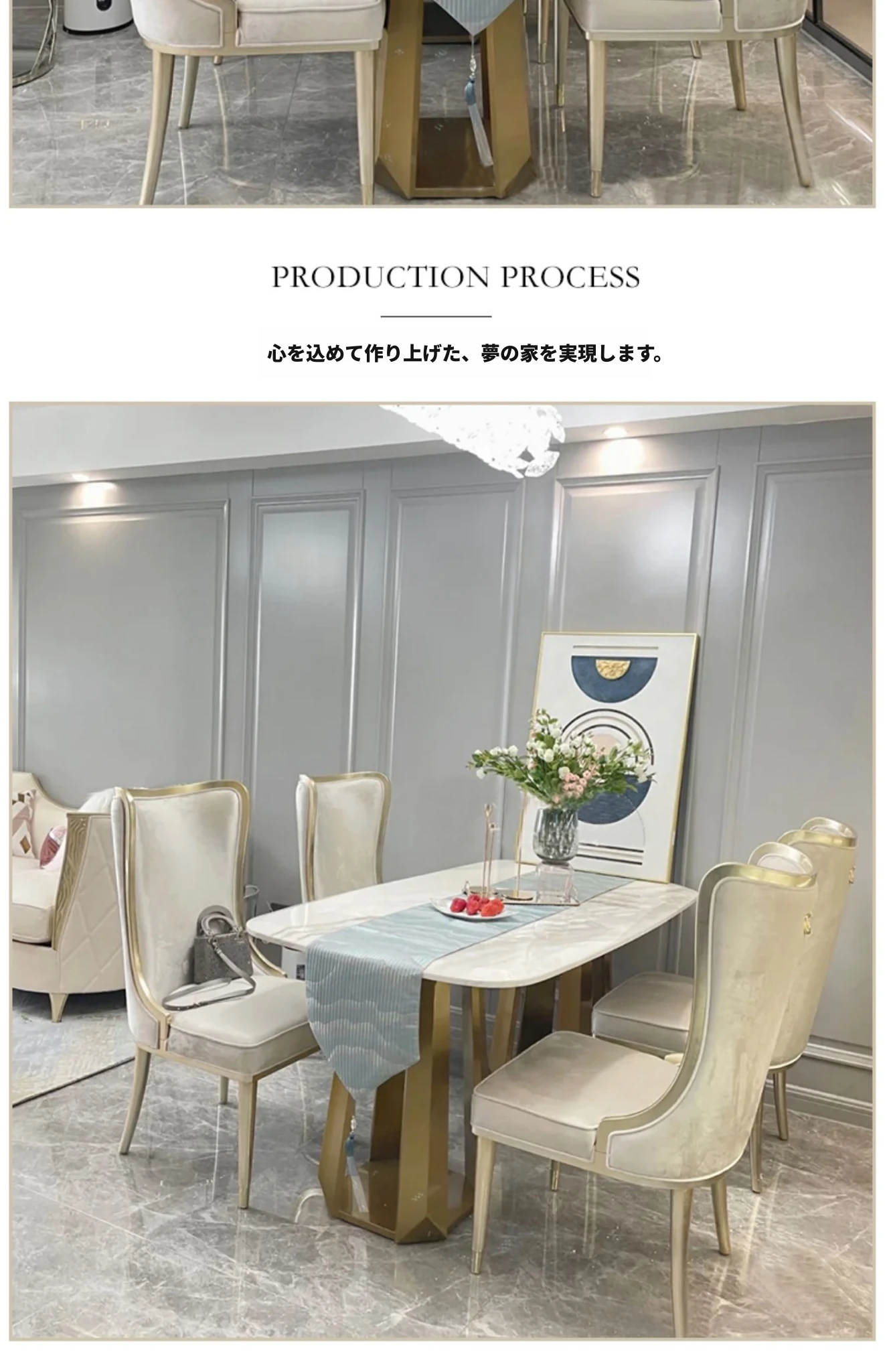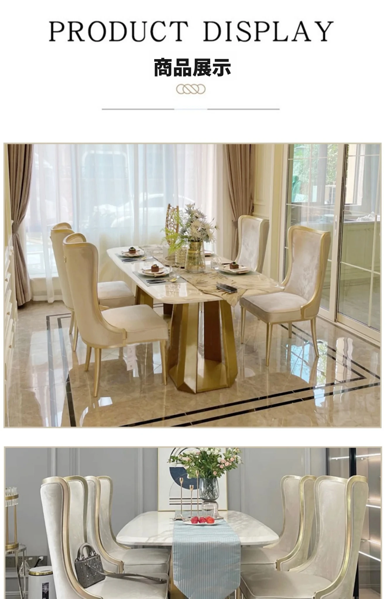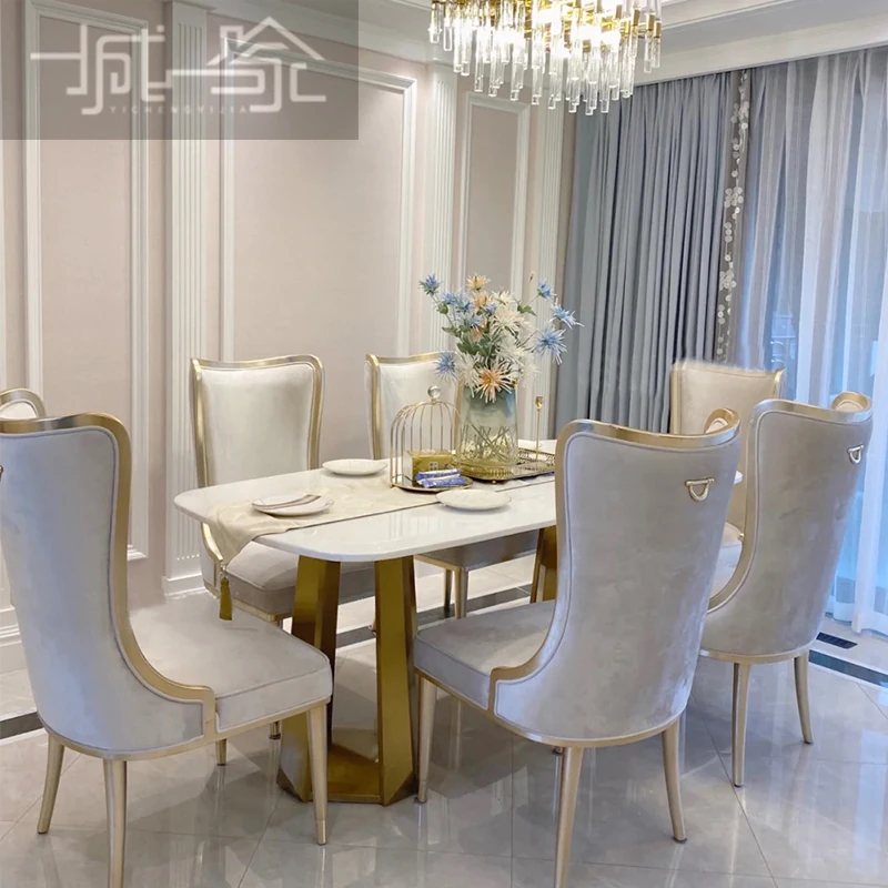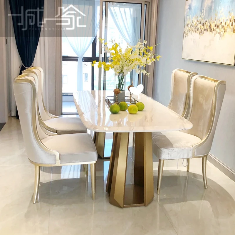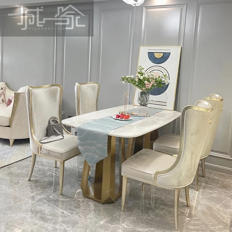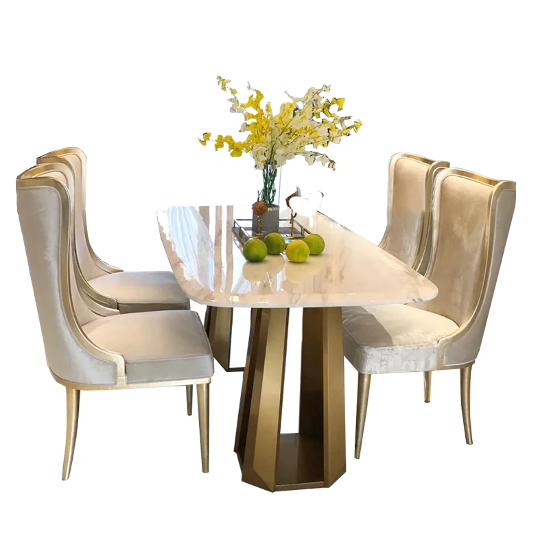 アメリカンスタイルのライトラグジュアリー!実木製ダイニングテーブル&チェアセット、現代的なミニマルデザイン。フレンチスタイルの小型住宅にぴったりな大理石ロングテーブル、1テーブルに6つの椅子付き!