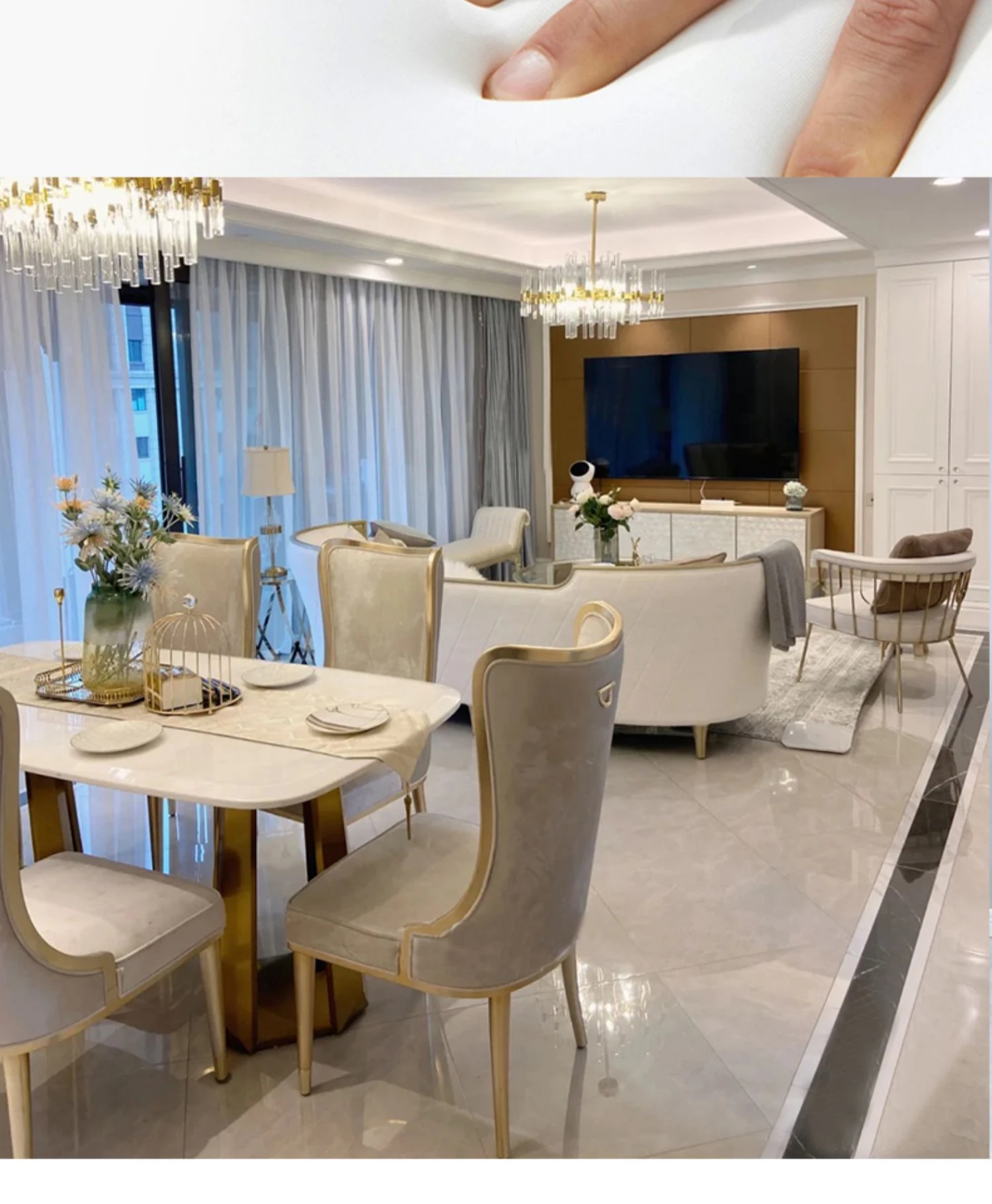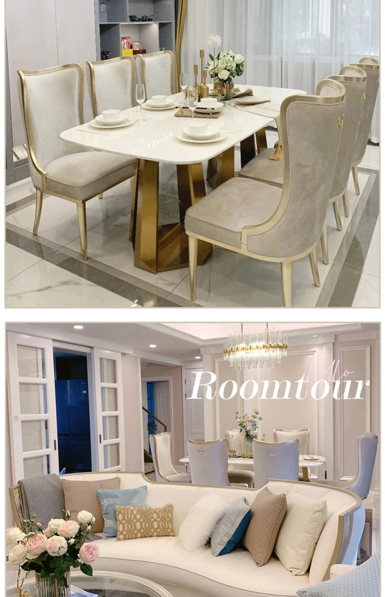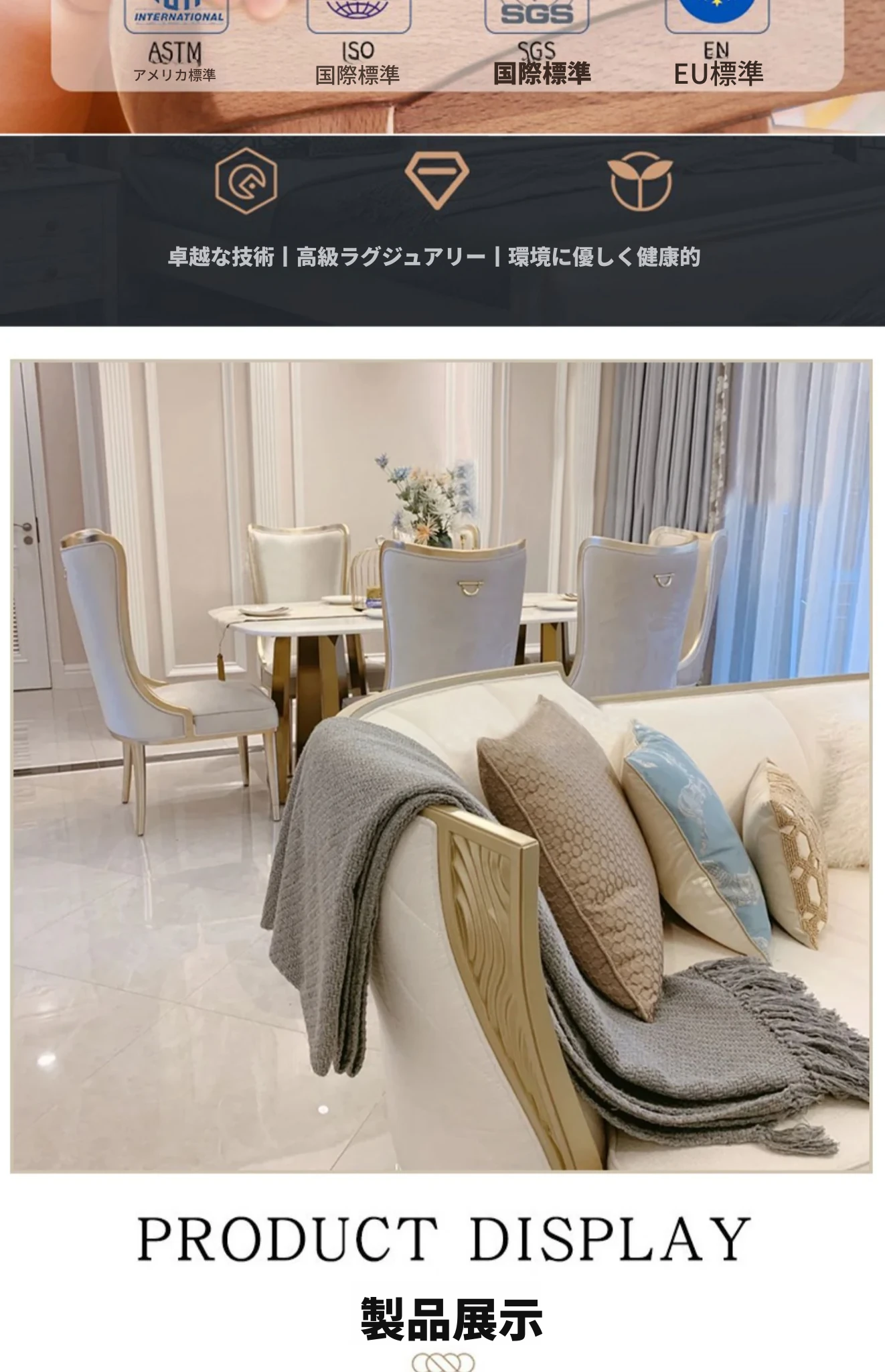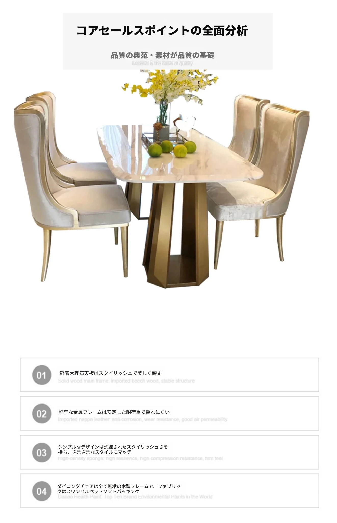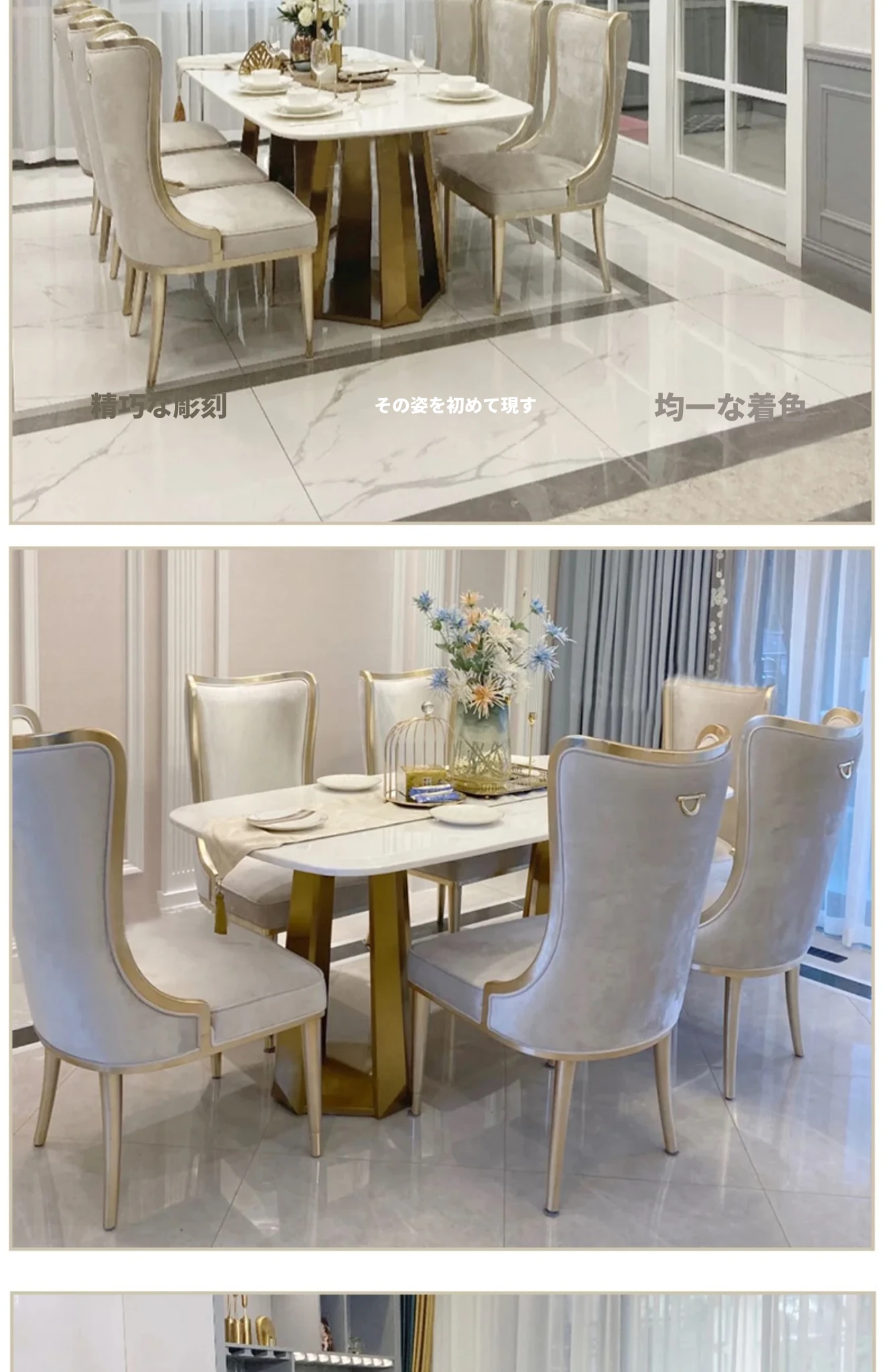 アメリカンスタイルのライトラグジュアリー!実木製ダイニングテーブル&チェアセット、現代的なミニマルデザイン。フレンチスタイルの小型住宅にぴったりな大理石ロングテーブル、1テーブルに6つの椅子付き!