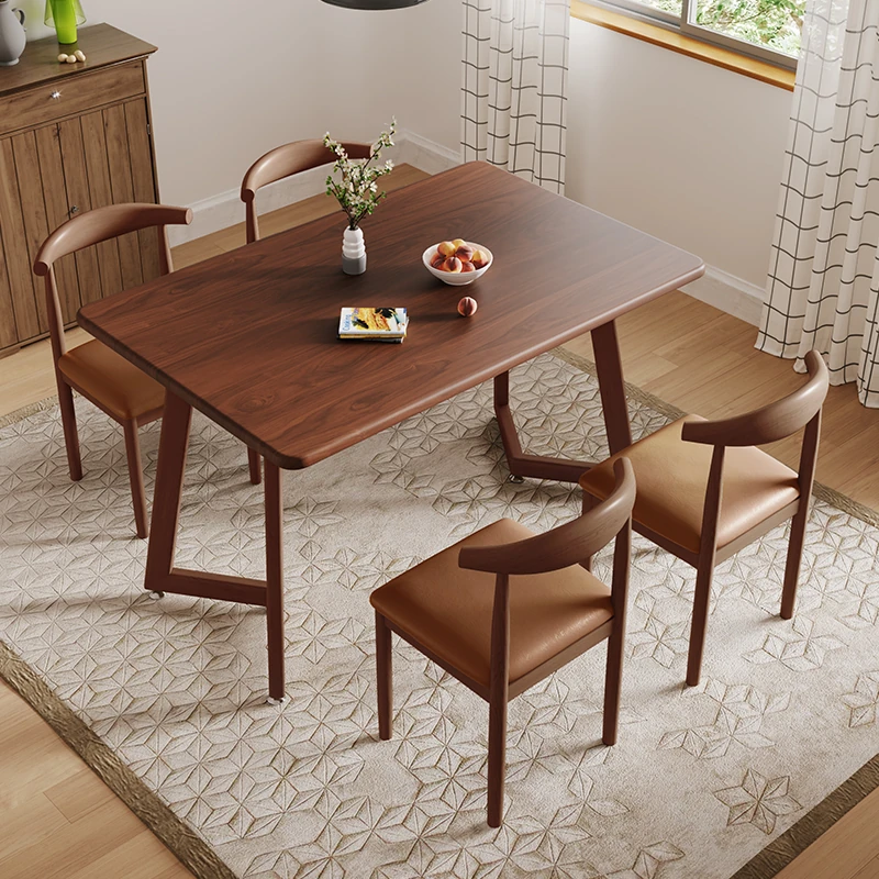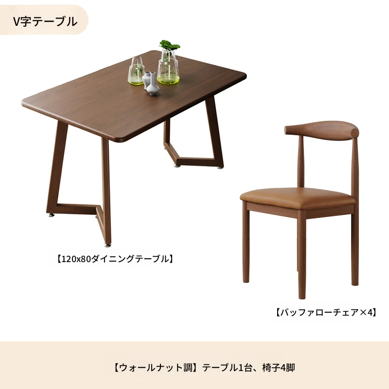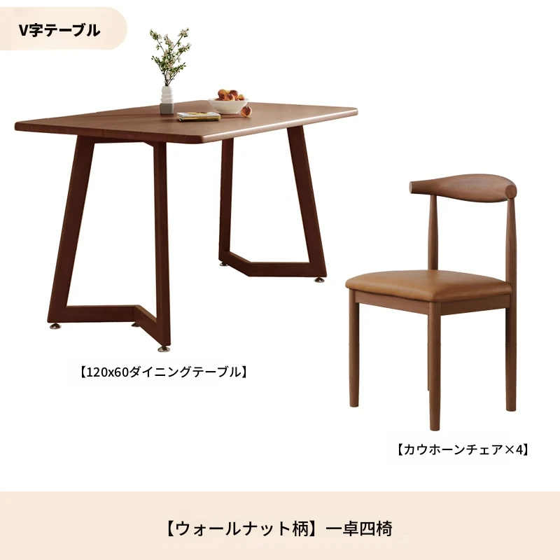 ウォールナットV字120*60+ブラウンPU牛角椅子*4