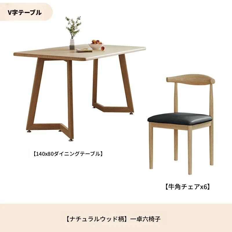 原木模様V字140*80+黒PU牛角椅子*6