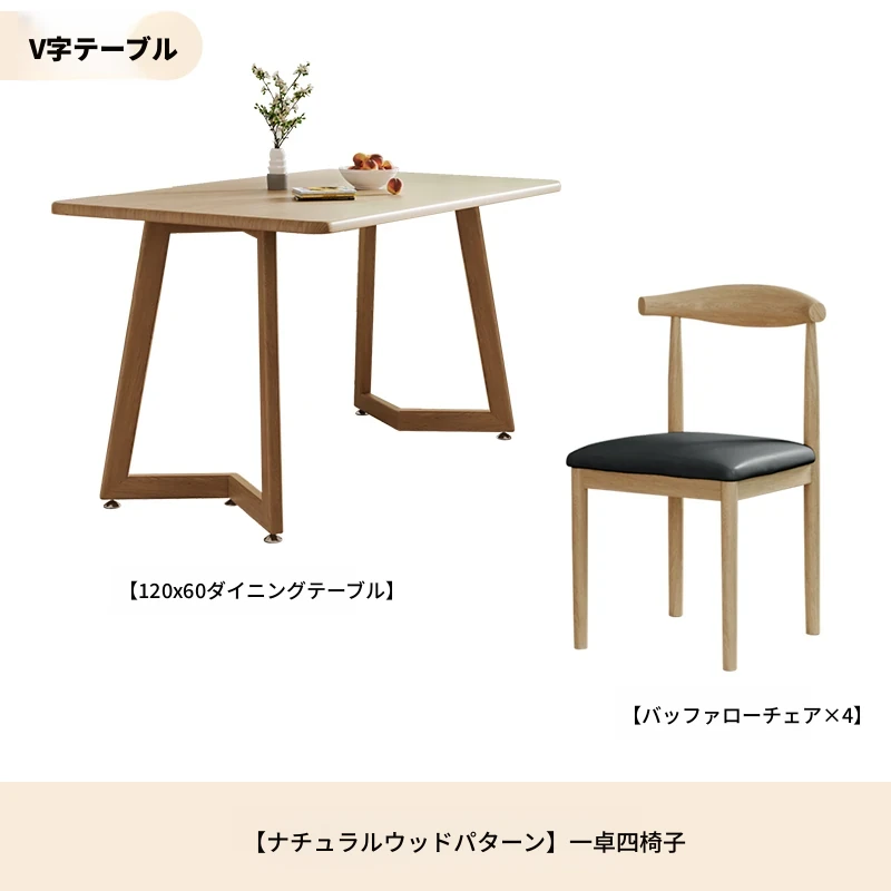 原木模様V字120*60+黒PU牛角椅子*4