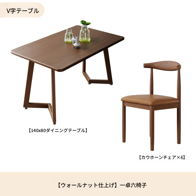 ウォールナットV字140*80+ブラウンPU牛角椅子*6