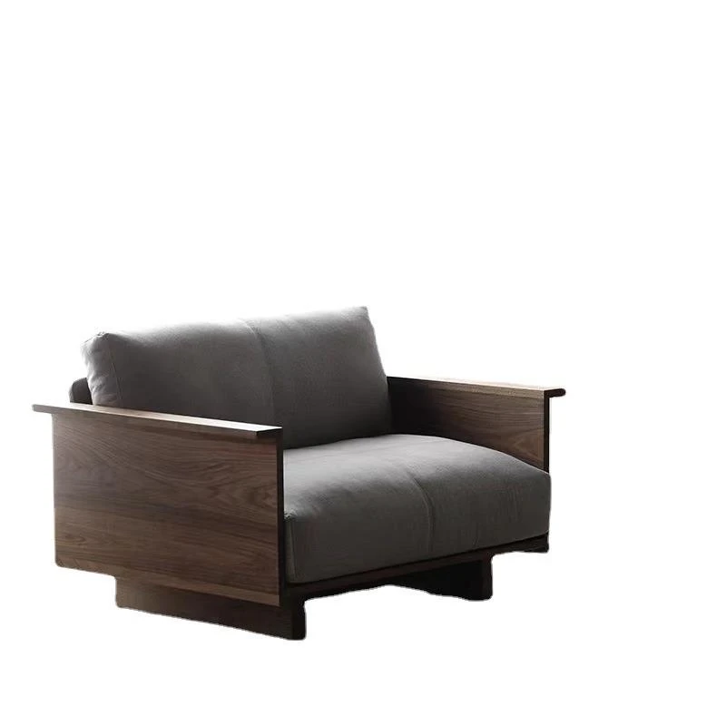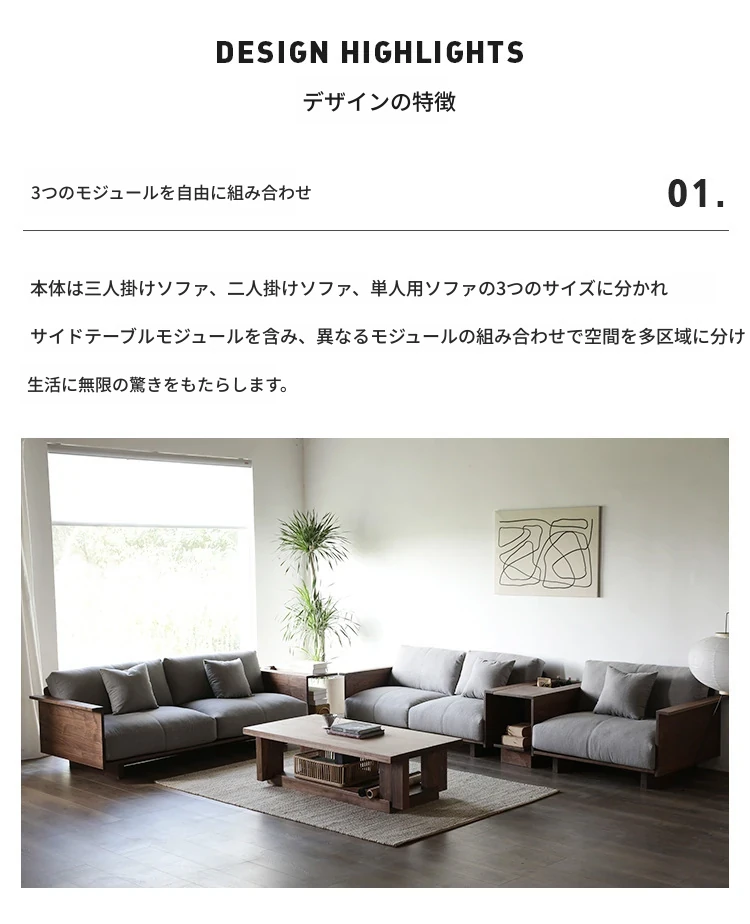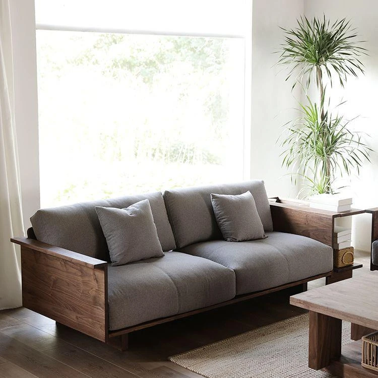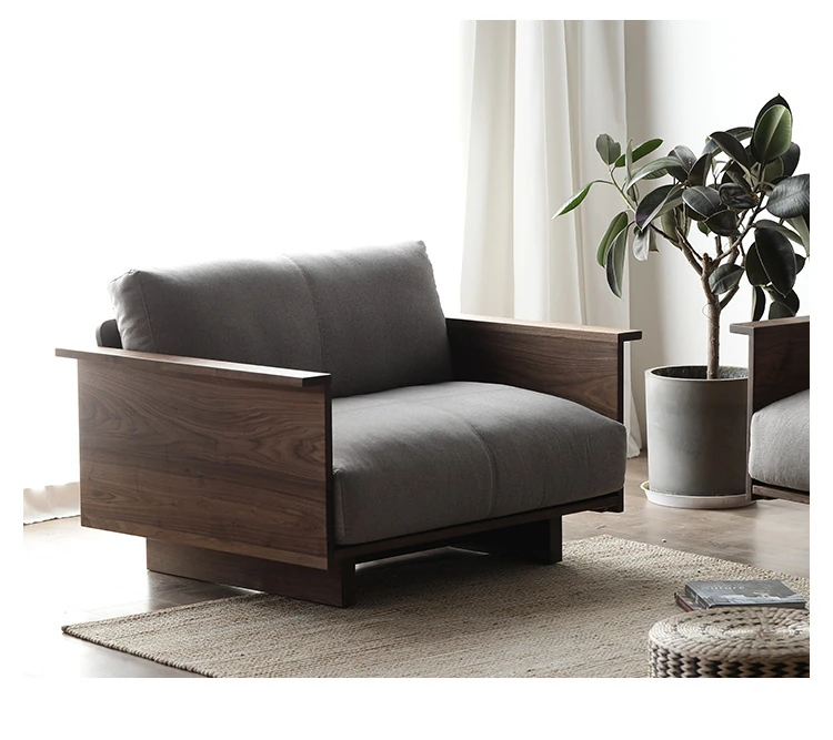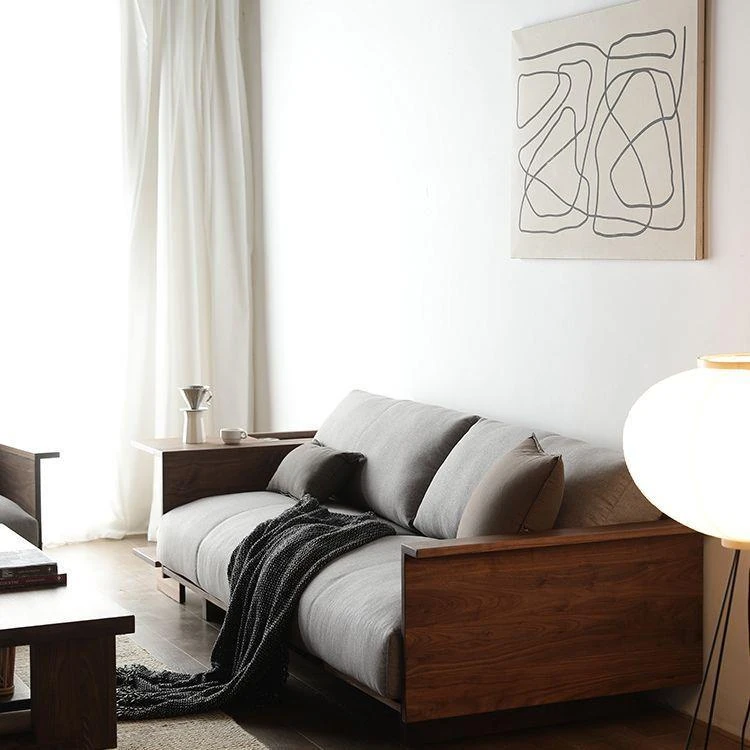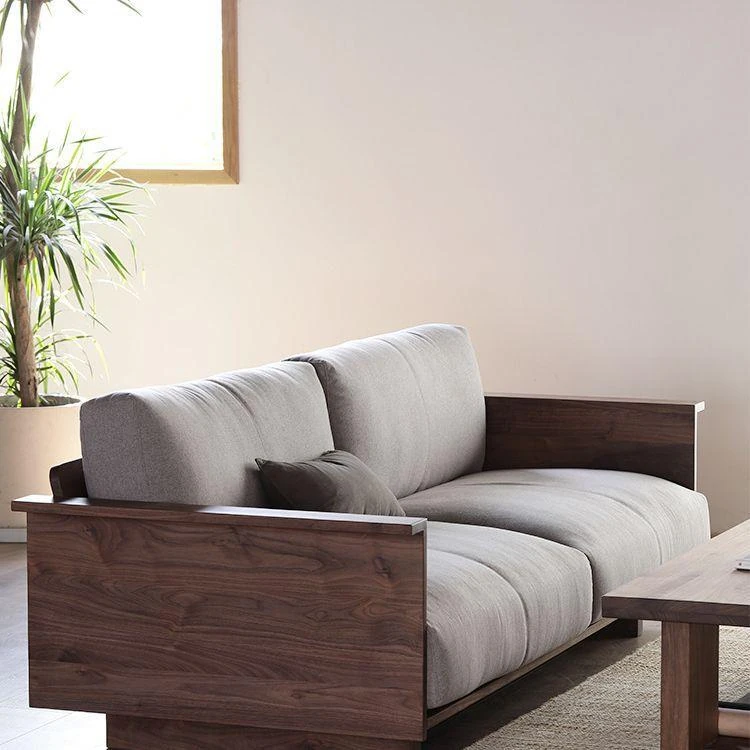 北欧スタイルのブラックウォールナット無垢材ソファ - コンパクトな現代的シンプルデザイン、和モダンな雰囲気、3人掛けリビング家具でおしゃれな空間を演出!