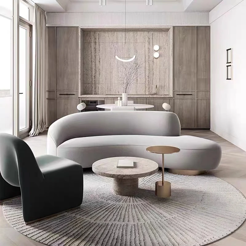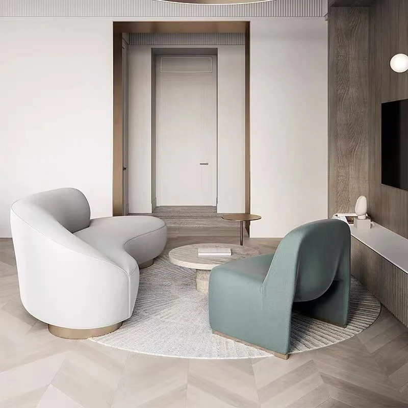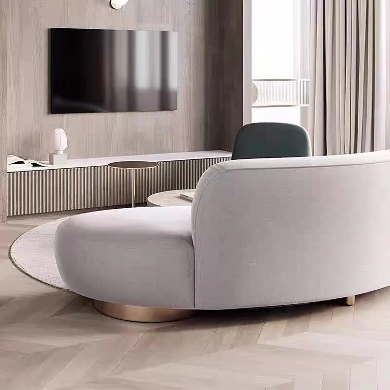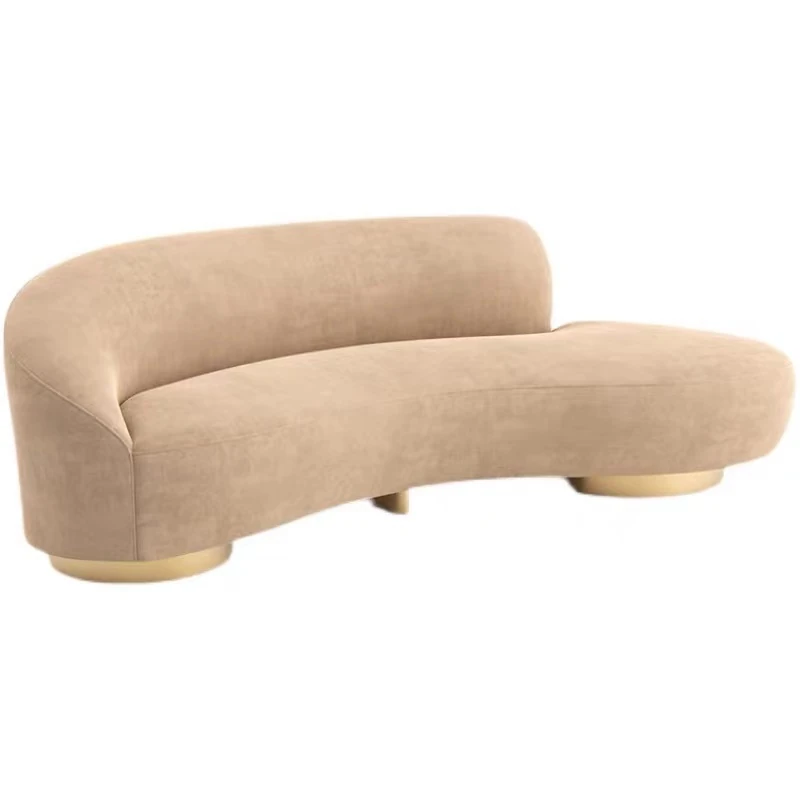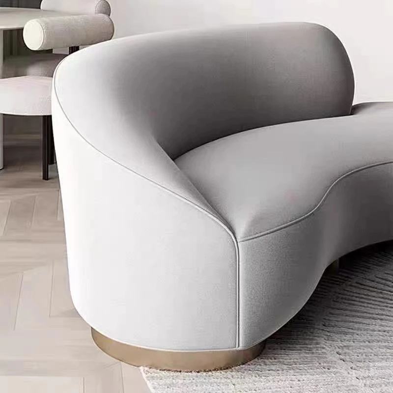 北欧スタイルの布製ソファ - シンプルで洗練されたデザイン、ホテルロビーやモデルルーム、サロンに最適なメタルハーフアーチ形状の3人掛けリビングソファ!快適さとスタイルを両立した特別な一品です。
