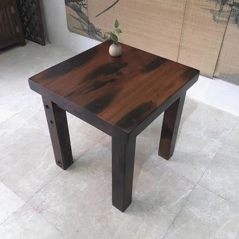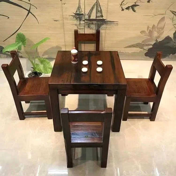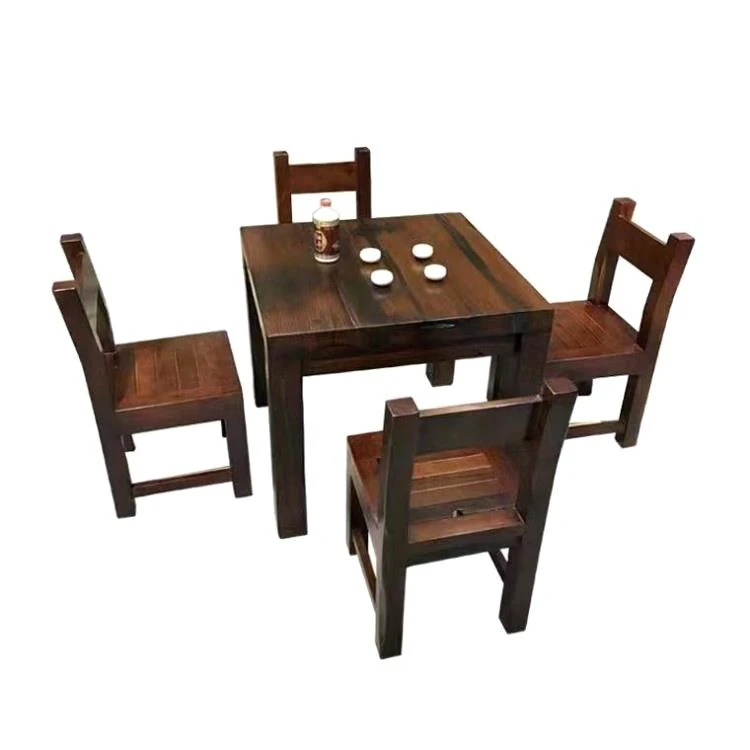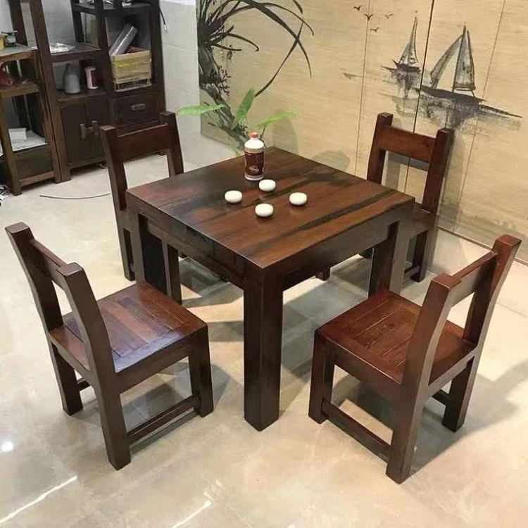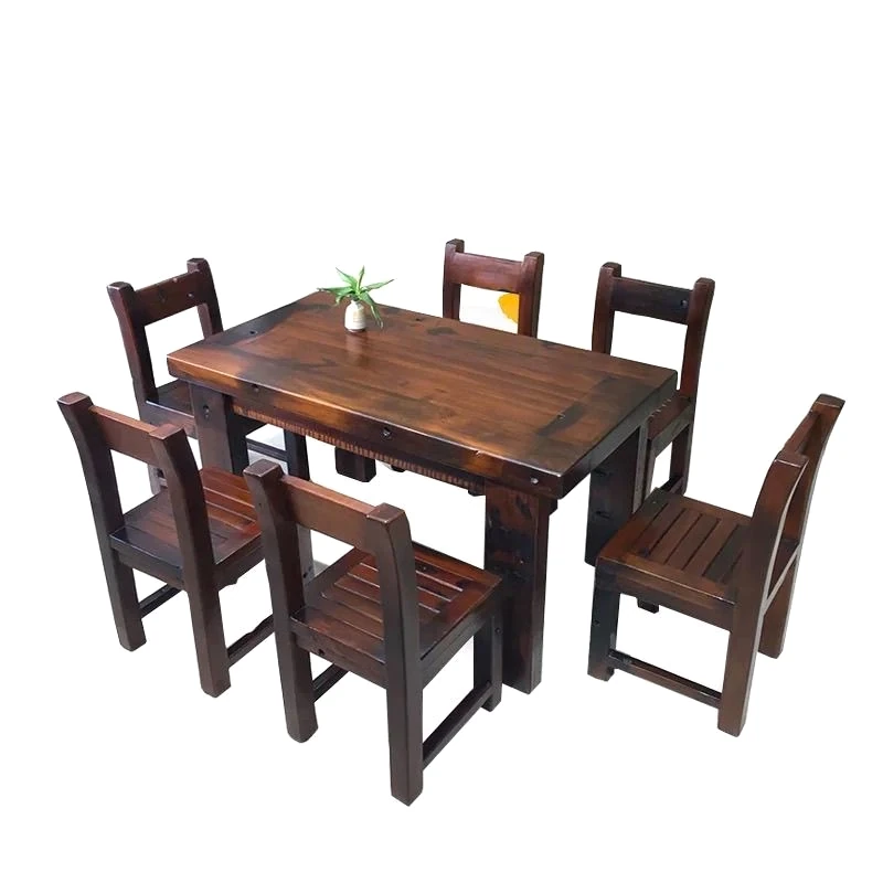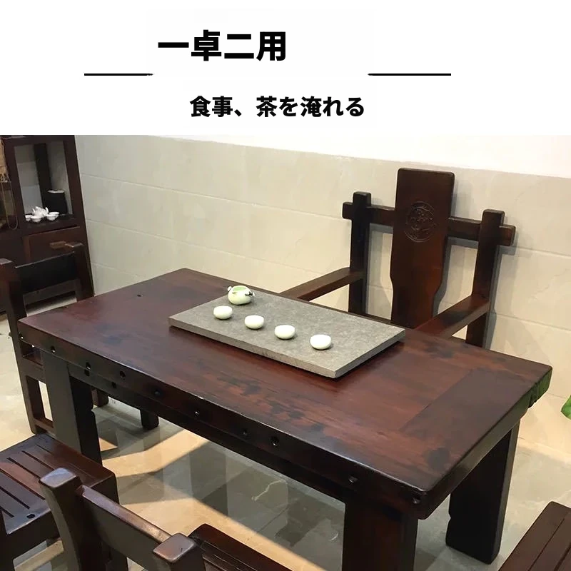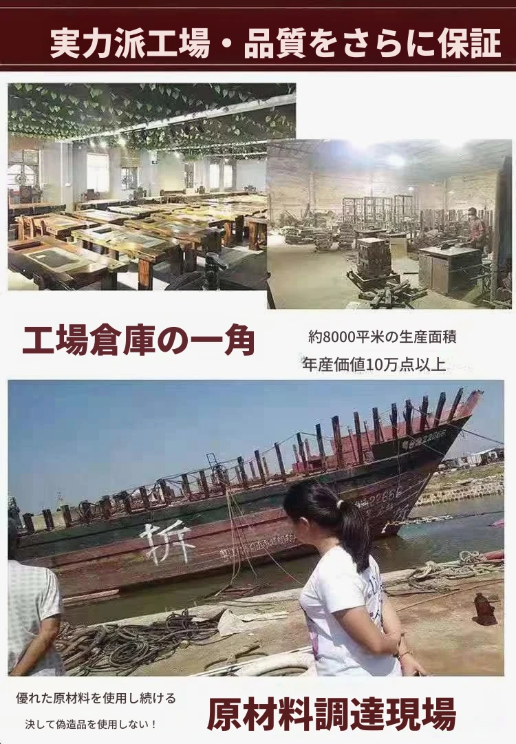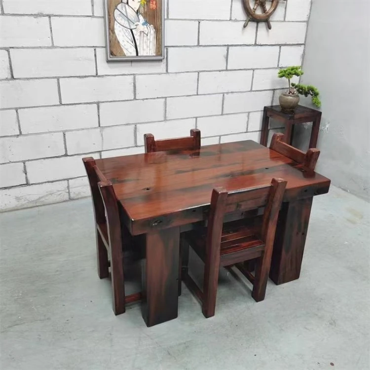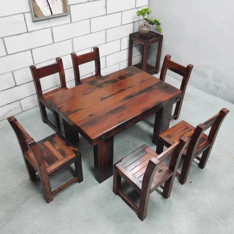 アンティーク船の木を使用したダイニングテーブル&チェアセット - 自然な風合いで、家族の団らんやお茶のひとときを彩る、リビングにぴったりの一体型テーブル。