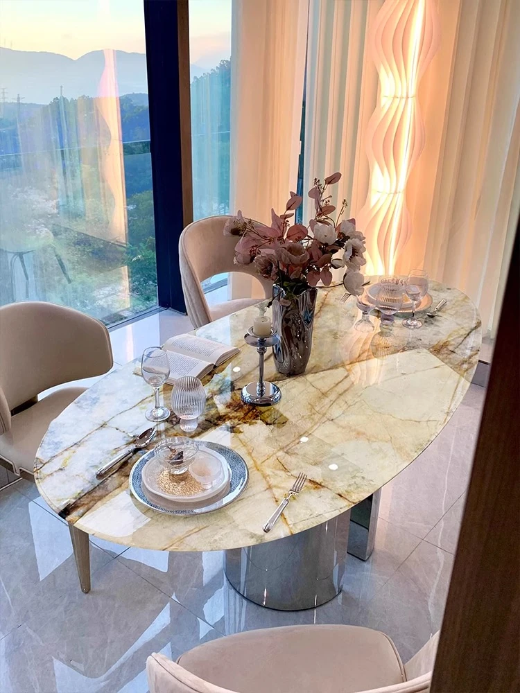 天然の雪山ラン奢石で作られたイタリアンスタイルの高級ダイニングテーブル。洗練されたデザインが魅力の別荘向け、上質な天然石のテーブルとチェアで、特別な食事のひとときを演出します。